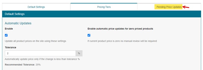 The tolerance value is a percentage you specify. It triggers an alert when a price change exceeds the percentage you entered. This alert is shown in the Pending Price Updates box. If an item is in the pending price updates box, the price will only change once you approve it. Many of our customers find setting this somewhere between 20% and 30% helpful. This value applies to your entire site.
