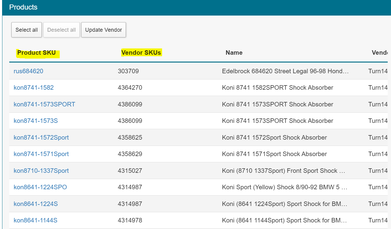 10. If your SKUs are mapped properly, it should be similar to the example below: Part Number in the left column (Product SKU) and the Turn 14 product ID in the right column (Vendor SKU).
