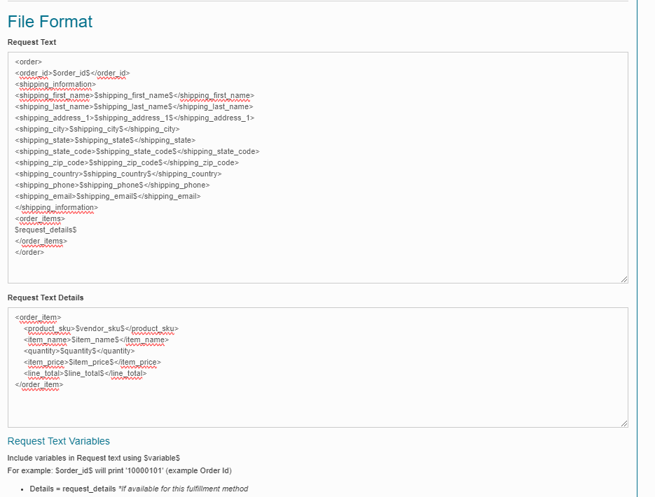 The following template serves as an example of a request text and request details structure for XML order fulfillment. However, it's important to note that this template may not work seamlessly with every vendor due to specific node requirements. To ensure compatibility, adjustments need to be made for each vendor’s unique XML structure. You should collaborate with the respective vendor to identify and implement their specific nodes for accurate order processing.