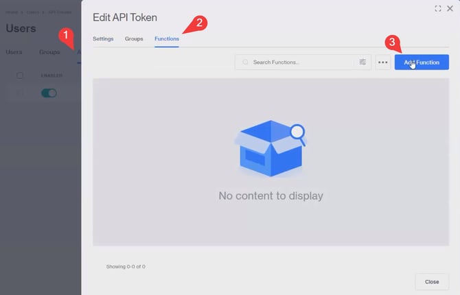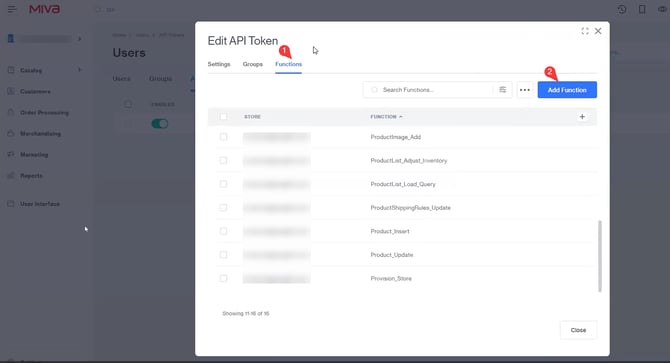 3.Select your new ShipStation API Token from your list of Users, then click Functions. (see image below for clarity)You'll have to add each of the bellow functions manually 1-by-1 by selecting the add function for the API token user.